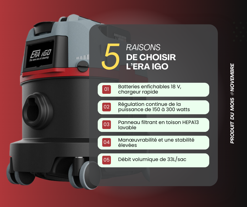 L'aspirateur à sec à batterie innovant ERA iGO garantit un maximum de flexibilité et de mobilité. La version 36 V Li-Ion combine un travail sans fil et autonome avec les caractéristiques uniques de la série de modèles ERA. Équipé de deux batteries de 18 volts et d'un moteur EC de 300 watts, l'ERA iGO vous permet d'obtenir un excellent résultat de nettoyage. Les batteries montées en série garantissent un travail autonome jusqu'à 90 minutes, tandis que le double chargeur rapide assure un temps de charge de la batterie d'environ une heure. Vous réglez la puissance en continu directement sur l'appareil, de 150 à 300 watts. Ainsi, la puissance d'aspiration peut être adaptée à tout moment et sans problème au revêtement de sol correspondant.